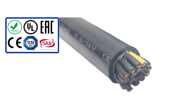 Структура продукта: Материал проводника: многожильный медный провод; соответствует классам 5 и 6 стандарта VDE0295 Изоляция: мягкая изоляция из высококачественного эластомерно-нитрильного материала Армирование: многослойный джут, самонесущий стальной провод, выдерживающий текущее напряжение Структура сердечника: многослойная антиторсионная структура Прокладочный слой: гибкий неплетенный прокладочный материал Материал оболочки: специальный материал, устойчивый к экстремальным погодным условиям и агрессивным средам Цвет: черный (RAL9005), серый (RAL7001), оранжевый ((RAL2003) Номинальное напряжение: больше или равно 1,5 кв. мм: 300/500V, более 1,5 кв. мм: 450/700V Испытательное напряжение: больше или равно 1,5 кв. мм: 2500V, более 1,5 кв. мм: 3000V Малый радиус изгиба: стационарно: 10 х D (внешний диаметр кабеля), подвижно: 12 х D (внешний диаметр кабеля) Рабочая температура: стационарно: от -30 С до +80 С; подвижно: от -20 С до +80 С (по запросу клиента от -55 С до +105 С) Сопротивление радиации: 8х107 кДж/кг Огнезащитный состав: соответствует IEC60332-1 и -2